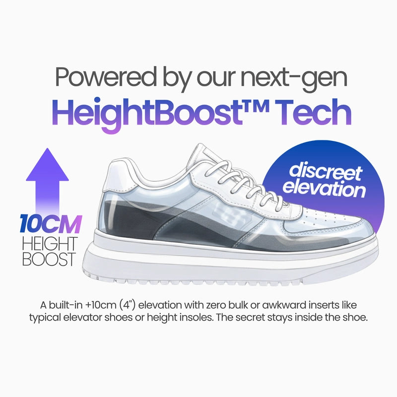 The 10cm elevation is engineered inside the midsole, so your heel sits in a deep, secure footbed, and not on top of a bulky, uncomfortable height insole. That's the magic of our HeightBoost™ technology. Try it once and you will never want to go back to wearing regular sneakers.
